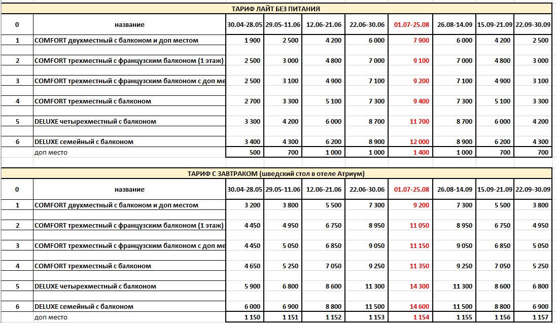 — Доступны тарифы с питанием: для удобства наших гостей действуют тарифы с питанием: напротив, в главном корпусе «Атриум» расположено уютное кафе-столовая, где проходят завтраки, обеды и ужины по системе «шведский стол»;