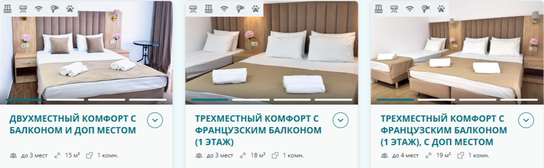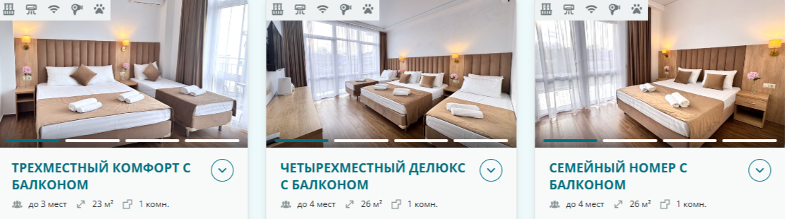 — Просторные номера: мы принципиально отказались от тесных помещений. Вас ждут светлые номера вместимостью от 2 до 5 человек, с удобными кроватями и ортопедическими матрасами, большими плоскими телевизорами и собственным балконом